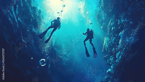 Two scuba divers ascend a submerged cavern. Sunlight streams down