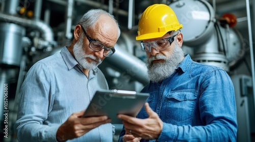 Two senior engineers are engaged in a discussion while analyzing project plans on a clipboard in a modern industrial workshop filled with machinery
