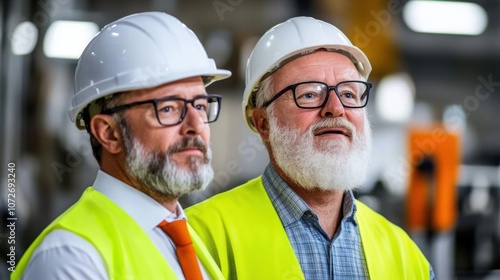 Two senior male engineers in hard hats and high-visibility vests discussing project in industrial