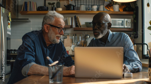 Two senior men are focused on a laptop screen in a cozy kitchen, illuminated by warm lights, conveying a meaningful and collaborative interaction.
