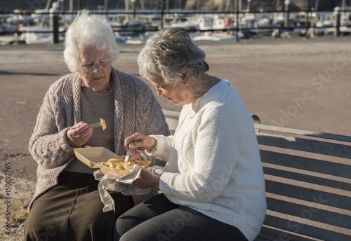 Two senior women eating chips on a bench outdoors on a sunny day