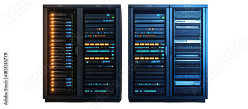 Two server racks with glowing lights isolated on transparent background