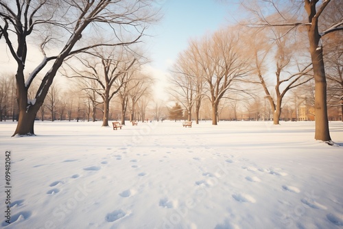 two sets of footprints meandering through a snowy park