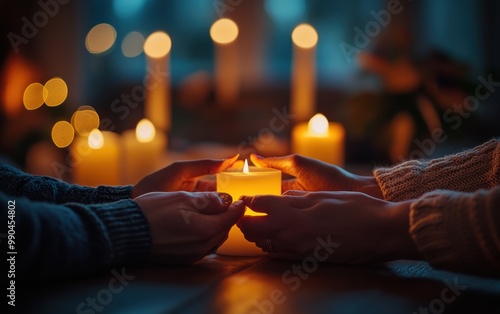 Two sets of hands holding a lit candle with other candles glowing softly in the background, creating a warm and cozy atmosphere.