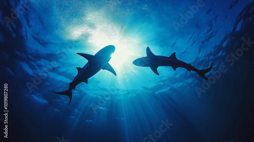 Two sharks swimming in the ocean, silhouetted against the bright light from above.