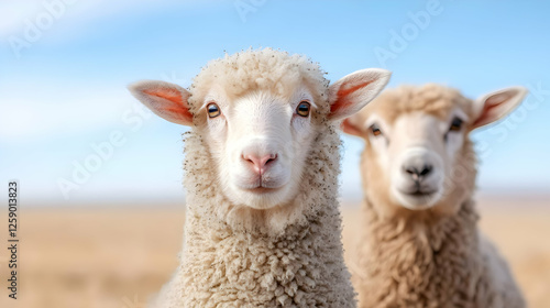 Two sheep in field, sunny day, pastoral scene, farm animals