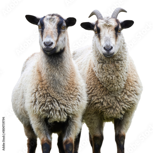 Two sheep standing side by side in a field with detailed wool and horns on one sheep captured with clean lighting and a transparent background