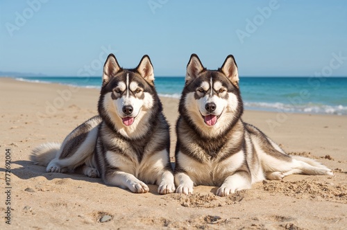 Two Siberian Huskies resting together by the water's edge. Summer beach scene with space for text.