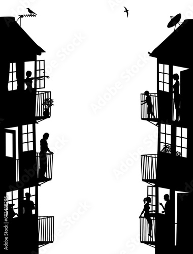 Two side panel silhouettes of blocks of flats with figures as separate objects