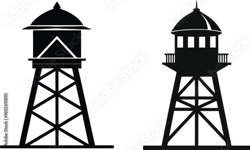 Two Silhouette Water Towers Isolated on White Background