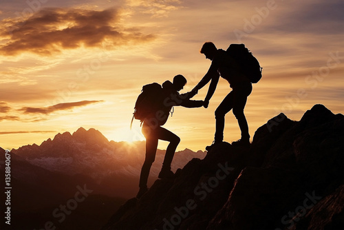 Two silhouetted figures assisting each other on a rocky mountain climb at sunset