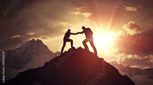 Two silhouetted figures stand on a mountain peak, reaching out to each other with a hand outstretched, against a backdrop of a glowing sunset and snowy peaks.
