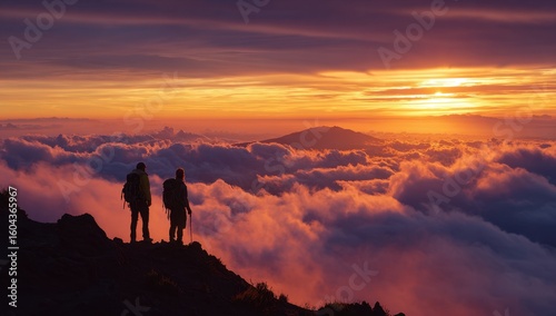 Two silhouetted hikers stand atop a mountain peak at sunrise, gazing at a breathtaking vista of clouds and a distant mountain.