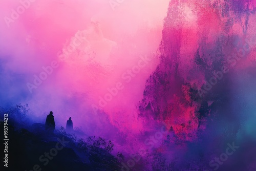 Two Silhouettes Standing in a Purple and Pink Foggy Landscape