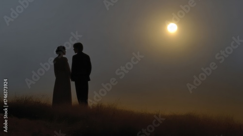 Two silhouettes under ethereal moonlight evoke cosmic romance, embodying Samhain's mystery and the Japanese Tsukimi moon viewing