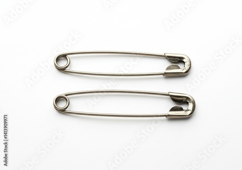 Two silver safety pins lying parallel on a white surface in a horizontal composition close up view