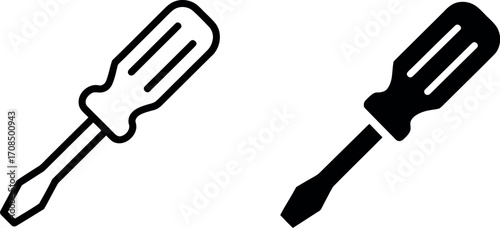 Two simple stylized icons of screwdrivers one outline one solid fill vector