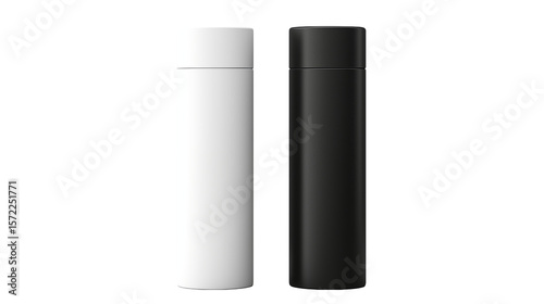 Two sleek metal flasks, one white and one black, isolated on transparent background