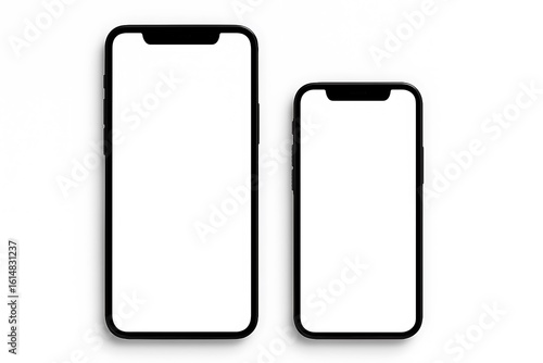 Two sleek, modern frameless smartphones with blank white screens are displayed on a white surface.