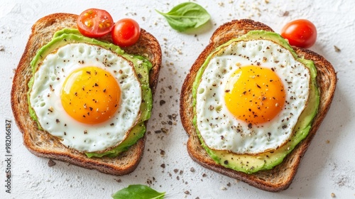 Two Slices of Avocado Toast with Fried Eggs, Tomatoes, and Basil on a White Background