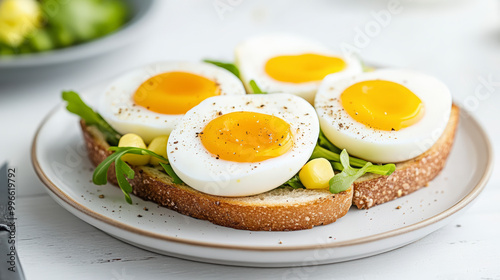 Two slices of whole grain toast topped with avocado slices, arugula, and perfectly cooked soft-boiled eggs, seasoned with salt and pepper.