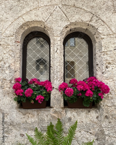 Two Small Arched Windows in an Ancient Beige Facade with Pink Geraniums on the Window Sill.