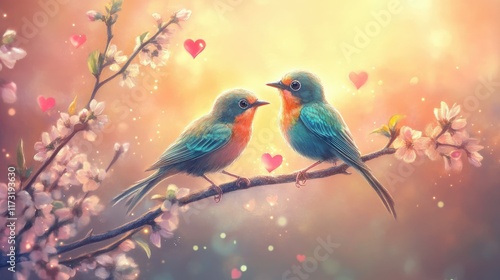 Two small, colorful birds perched together on a blooming branch with hearts and warm, diffused light around them