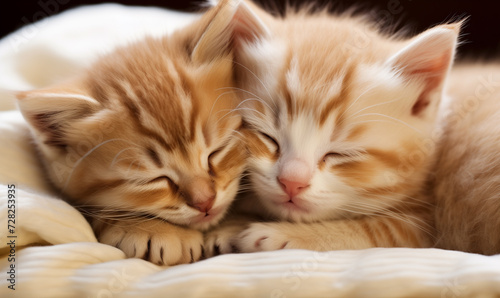 Two small domestic kittens sleeping together at home lying on bed white blanket