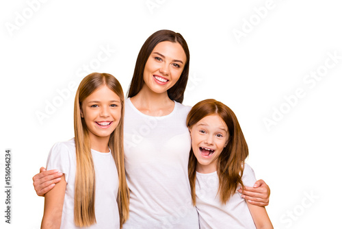 Two small ladies with young nanny hugging wear casual white t-shirts isolated yellow background