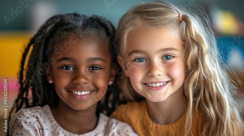 Two smiling girls close-up, diverse friendship, young children, happy kids, diverse friends, childhood happiness, friendship bond, smiles, youth, innocence, diverse cultures, cheerful