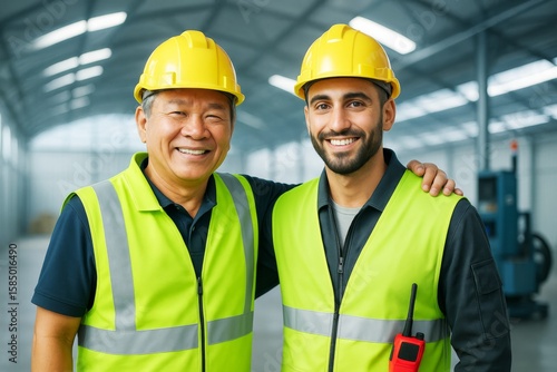 Two smiling industrial workers in safety vests and hard hats inside a modern factory with bright lighting and professional background.