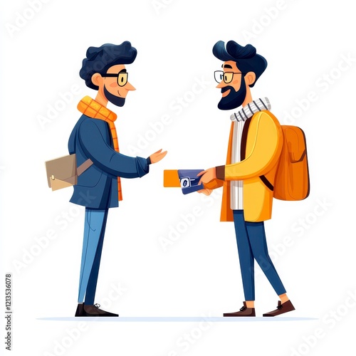 Two Smiling Men Exchanging Items in a Friendly Outdoor Encounter, Illustrated in a Bright Pixel Art Style
