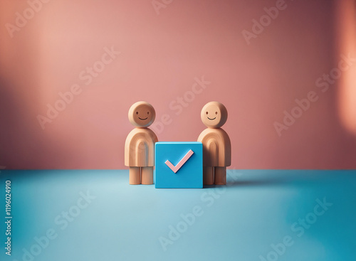 Two smiling wooden figures stand beside a blue cube displaying a checkmark, signifying agreement, collaboration, or task completion. A soft, minimalist background enhances the positive message.