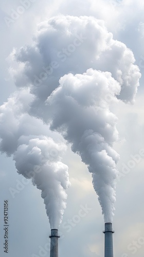 Two smokestacks release white smoke into a clear blue sky, illustrating industrial activity and environmental impact