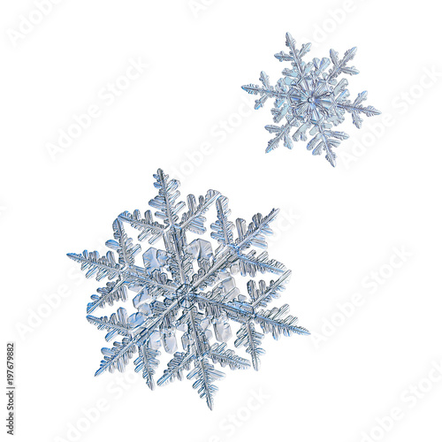 Two snowflakes isolated on white background. Macro photo of real snow crystals: large stellar dendrites with complex, elegant shapes, fine hexagonal symmetry, thin, ornate arms and glossy surface.