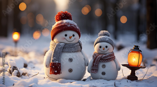 Two snowmen with lantern in winter forest. Christmas background with snowman.