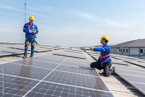 Two solar panel technicians in hardhats and safety gear inspect the installation on a commercial building.