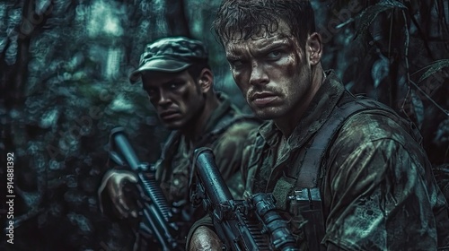Two Soldiers Camouflaged in Dense Foliage, Holding Rifles