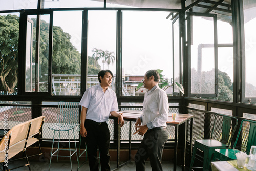 Two Southeast Asian men engaging in an enthusiastic conversation