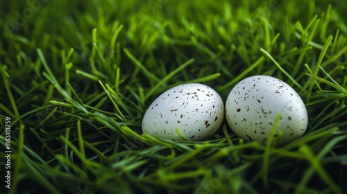 Two speckled eggs are nestled in lush green grass, creating a natural and serene setting. The arrangement allows for text overlay and creative design