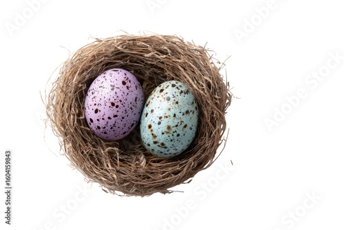 Two speckled eggs nestled in a bird's nest