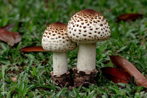 Two spotted mushrooms growing in lush green grass during a sunny afternoon in a garden