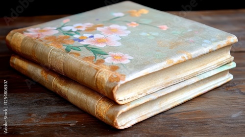Two stacked decorative books, light beige and gold, decorated with floral patterns in pastel colors, placed on a dark wooden surface