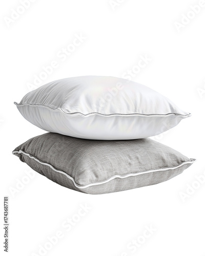 Two stacked pillows, one white cotton and one grey linen, both with stitched piping and soft corner compression, clean cozy aesthetic, isolated on transparent background.