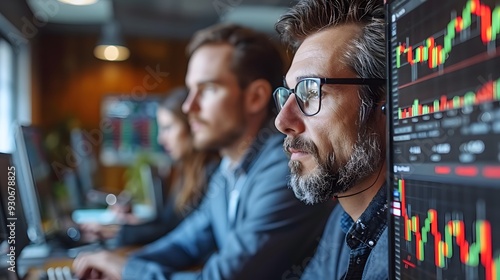 Two stock exchange traders analyzing digital currency or market online focusing on dynamic data monitor. Discussion of increased possible trend investment at neon light decorative workplace. Sellable.