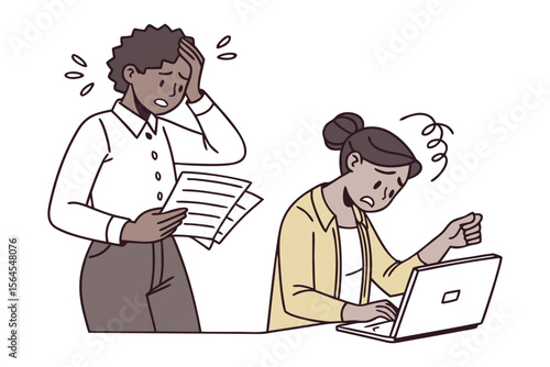 Two stressed individuals struggling with work tasks one holding papers and the other using a laptop displaying clear signs of frustration and anxiety