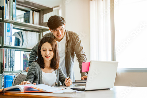 Two students are reading and discussing about exam preparation, presentation, study for test preparation in library.Education, Learning, Student, Campus, University, Lifestyle concept.
