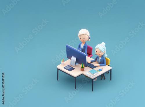 Two stylized 3D figures, possibly teacher and student, collaborate on a desktop computer at a desk. The scene is minimalist and digitally rendered, using pastel colors.