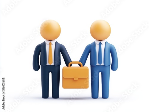 Two stylized business figures shaking hands while holding a briefcase in a minimalistic setting