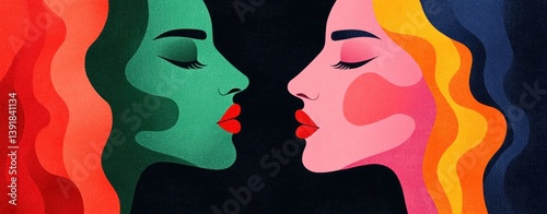 Two stylized female faces with vibrant colors and wavy hair almost kiss, a modern art illustration.